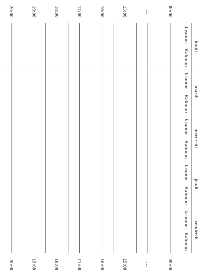 Rahman a le cours de maths et de science mercredi de dix-sept heures à dix-huit heures. Il a aussi le cours de dessin de seize heures trente à dix-sept heures. Il joue avec ses copains et ses copines de dix-huit heures à dix-neuf heures. Jasmine a un cours de tennis de seize heures trente à dix-sept heures et un cours de violon de dix-huit heures à dix-neuf heures.