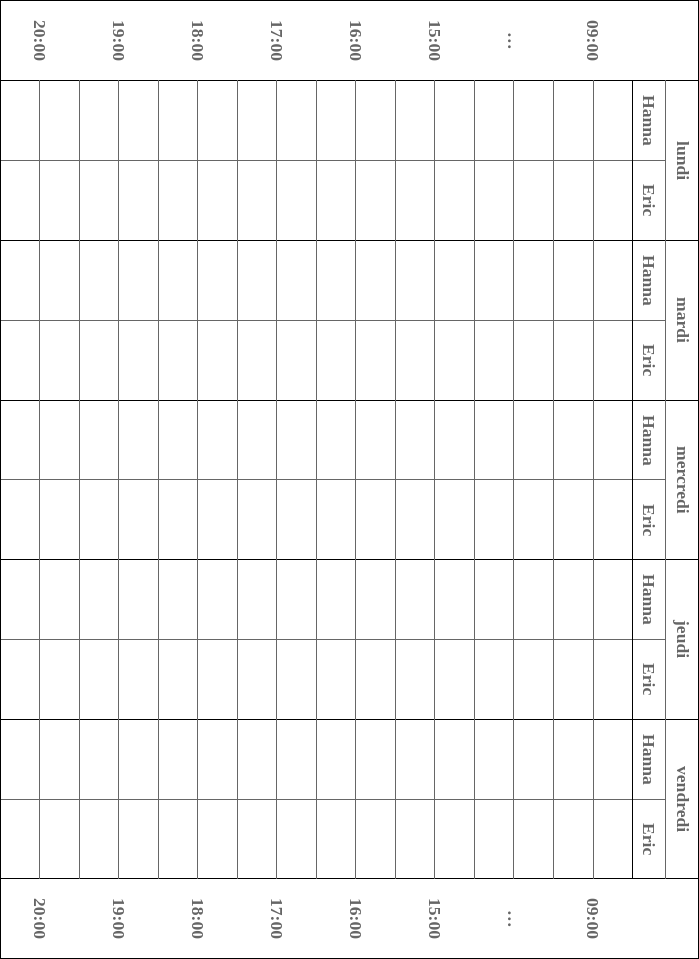Hanna a les cours à l'école de neuf heures à quinze heures trente. Eric fait des activités en addition, donc il a cours de neuf heures à seize heures. Tous les jours, Hanna et Eric prennent le dîner à dix-neuf heures et se couchent (go to bed) à