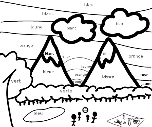 Colour the boxes according to the colour given rouge bleu OR bleue vert OR verte rose jaune orange blanc noir
